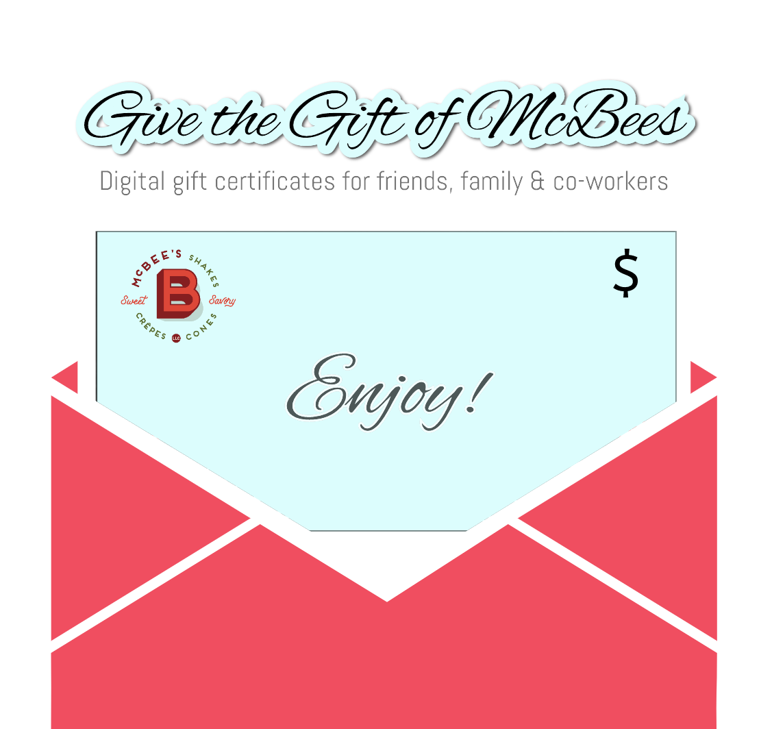 Simply place your order online between 2pm and 4pm on a Tuesday and you'll get a $2 credit on your order, plus we'll double your purchase rewards on the balance. That's 20 cents for every dollar you spend towards your next visit to McBees! Your rewards will be active Wednesday morning ready for your next visit to McBees, and they never expire! What's that we hear you asking? You: "Can I enter an order online between 2pm and 4pm for pickup later in the day, say for dinner crepes and desserts?" Us: "Well... abso-crepe-a-lutely! Of course!" As long as you submit your order before 4pm you are good to go for pickups until closing. You can even enter PRE-ORDERS for crepe platters, flights and ice-cream cakes for pickup the next day or later in the week!
